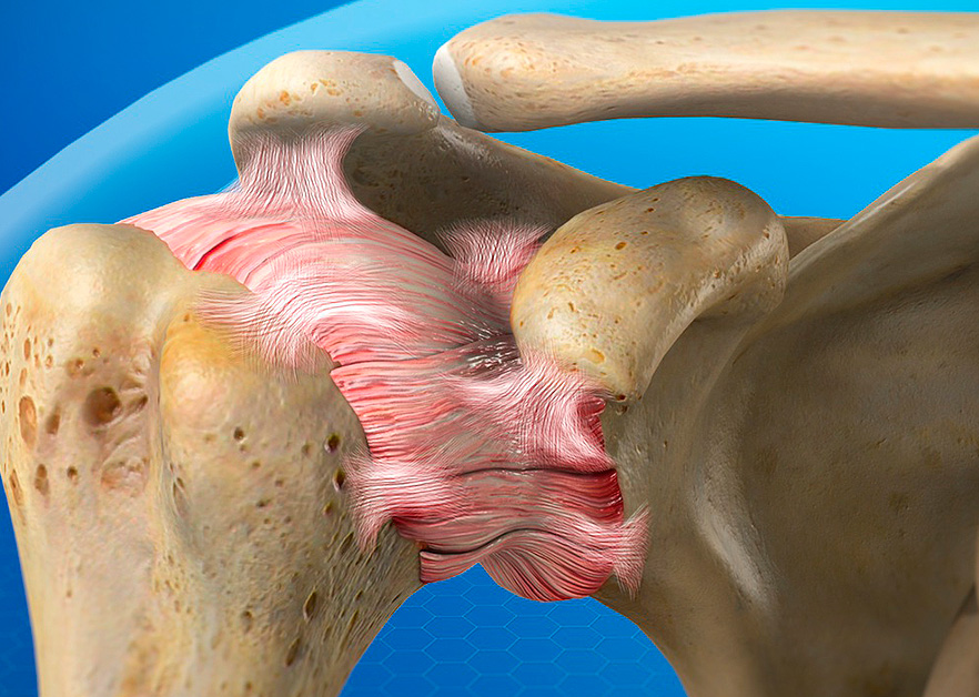 Em uma das extremidades da escápula está a glenoide, responsável por articular a escápula ao úmero (protegidos por cartilagem). Já a união dos quatro tendões, denominada manguito rotador, envolve a cabeça do úmero. Além disso, o ombro também é sustentado por músculos.